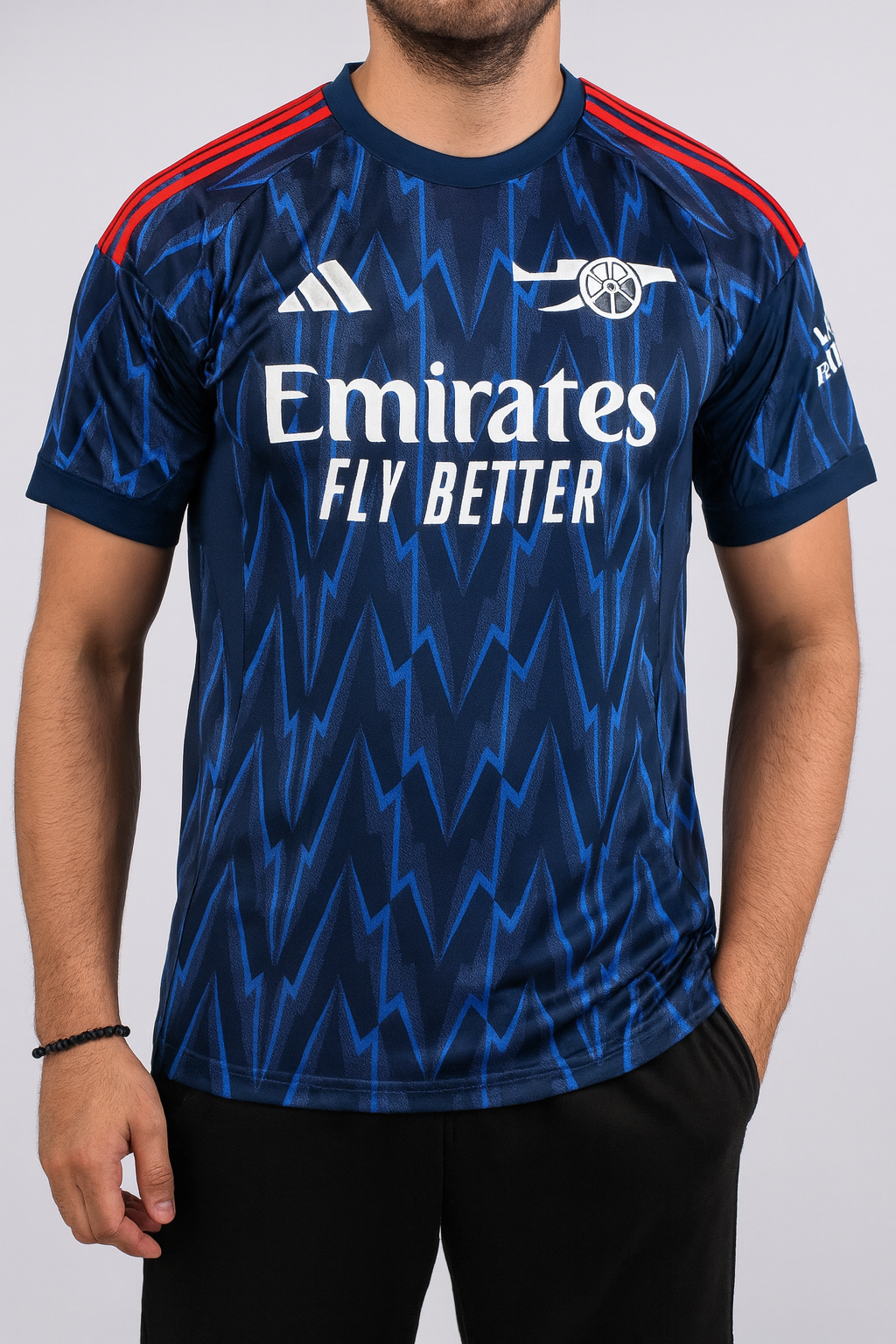 Stand out with the electrifying 2025/26 Arsenal Away Fan Jersey. This jersey features a bold lightning-inspired design in deep navy and bright blue accents, combined with lightweight AEROREADY performance fabric for maximum comfort.
