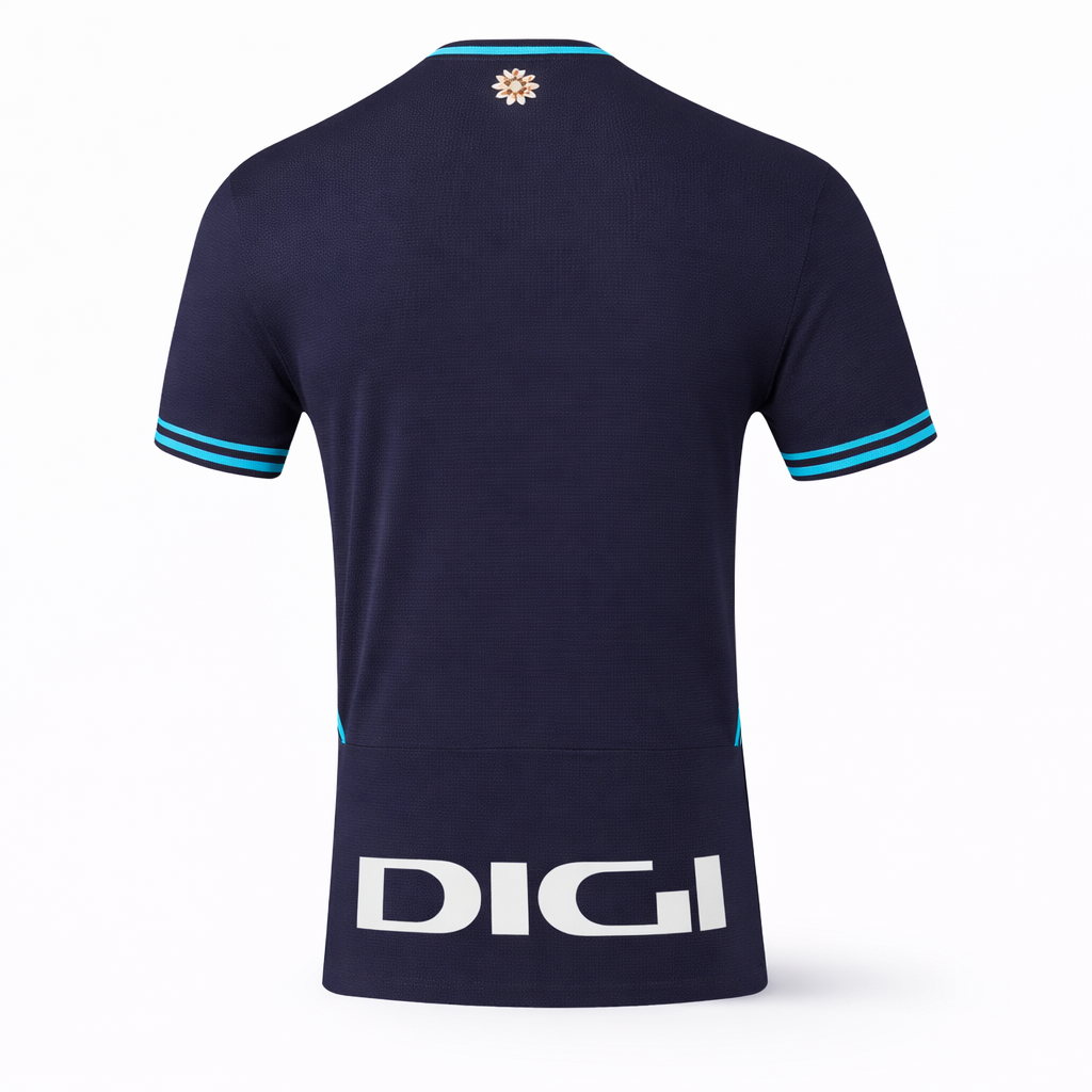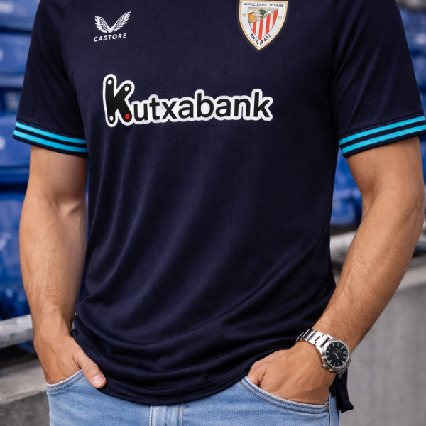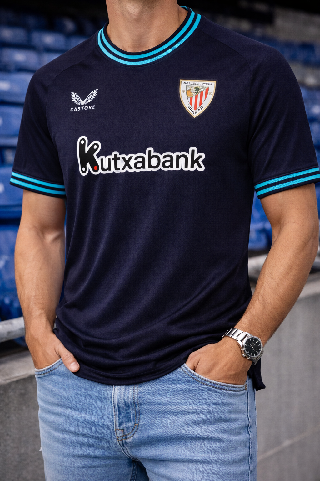 The Athletic Bilbao 2025/26 Away Jersey presents a sleek navy base with striking contrast trim,