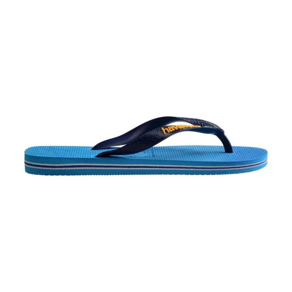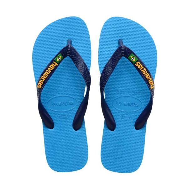 The Havaianas Brazil Logo Turquoise delivers a vibrant summer look with its turquoise sole and contrasting navy straps, featuring the iconic Brazilian flag logo.