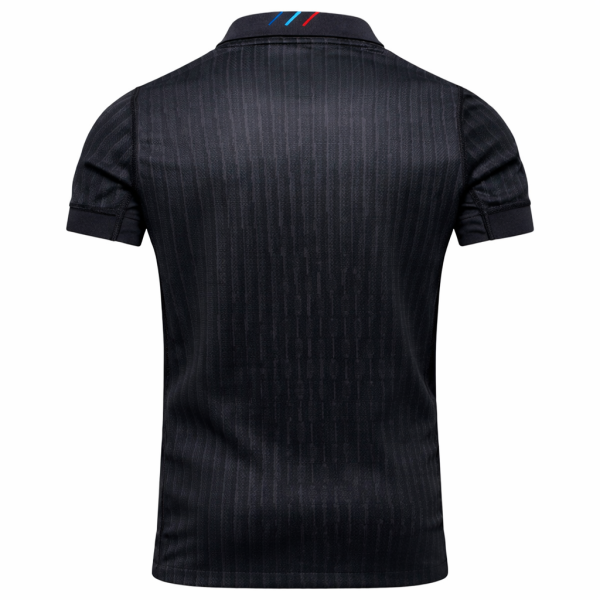 The PSG 2025/26 Fourth Jersey features a sleek black design with subtle vertical striping and a signature red centre stripe. Designed in collaboration with the Jordan Brand, this kit blends football culture with streetwear style.