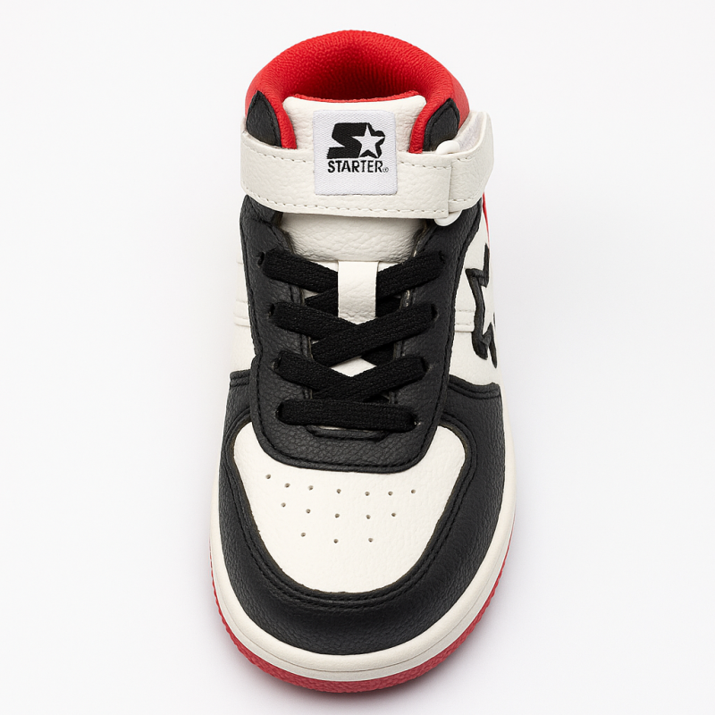 Made from premium leather, this stylish high-top combines durability, comfort, and bold Starter branding in a striking white, black, and red color mix.