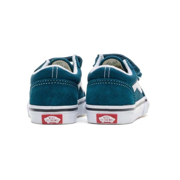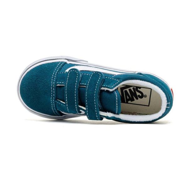 The Vans Old Skool V Deep Teal miniaturizes the classic Vans look for little feet. Crafted with durable teal canvas and suede, the shoe includes two Velcro straps for easy fastening and the signature Vans side stripe for that timeless touch. The soft lining and waffle outsole ensure comfort and grip for growing adventurers.